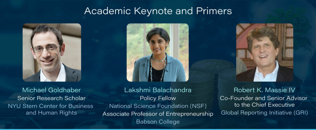 The comprehensive agenda will kick off with an opening academic keynote by Michael Goldhaber, Senior Research Scholar, NYU Stern Center for Business and Human Rights, and feature academic primers by Lakshmi Balachandra, Policy Fellow, National Science Foundation (NSF) and Associate Professor of Entrepreneurship, Babson College, and Robert K. Massie IV, Co-Founder and Senior Advisor to the Chief Executive, Global Reporting Initiative (GRI).